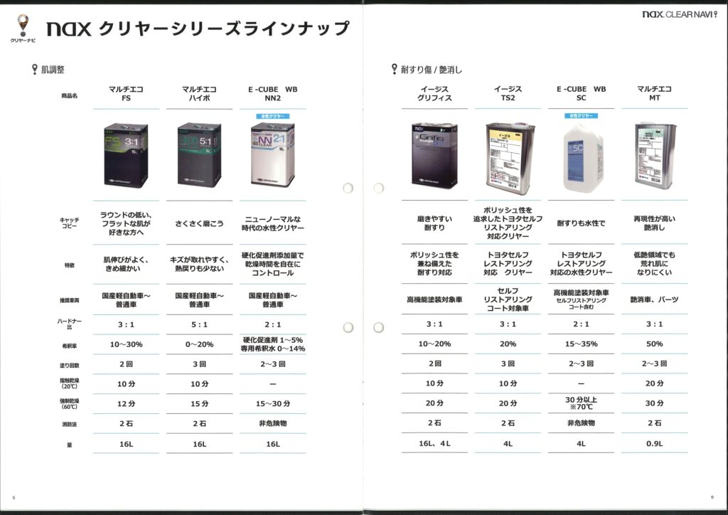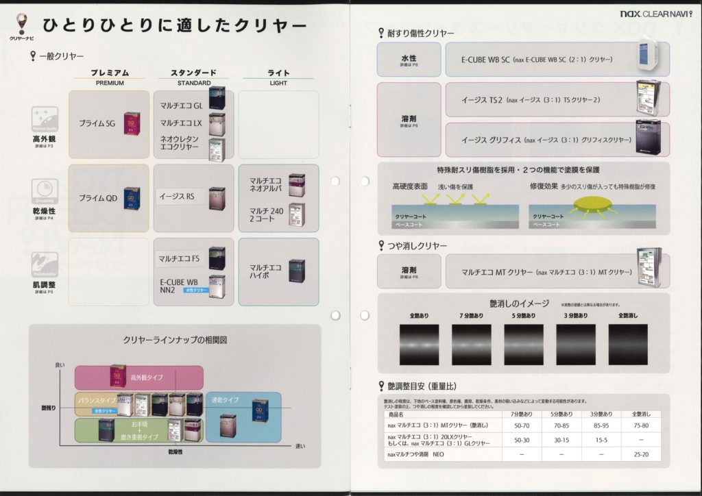 仕上がりの質感や作業条件に応じたクリヤー選びのポイントが分かりやすく掲載されており、クリヤー選びの際にお役立ていただける内容となっております。